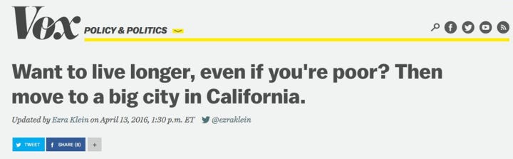 Now let’s think about this one for a second. What could be the causal mechanism? Perhaps big cities have better healthcare? Perhaps they have better access to cheaper high-quality food? Maybe there’s something about the energy or social dynamics in a city that make you live longer? But one thing we can say is that the mere fact that you’re in a big city in California does not cause you to live longer. There is likely a shared mechanism somewhere in there, but if we were to hold everything else constant (i.e. same healthcare, same food, same social situations, same weather, etc.) does the fact that you live in a big city in California somehow affect your longevity? No. This is a great example of the real causal mechanism being obscured by a flashy headline.