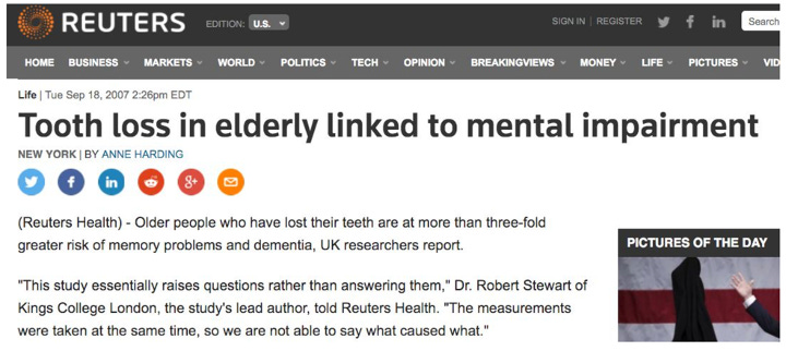 Ahh yes, we all know that childhood song: “The head bone’s connected to the brain bone, the brain bone’s connected to the tooth bone…” My favorite part of this story is the quote from Dr. Stewart at the end of the second paragraph: “… so we are not able to say what caused what.” That may be true, but I can tell you what certainly did NOT directly cause dementia… losing your teeth. One may be surprised to learn that we don’t store memories in our teeth. While it is entirely possible that losing ones teeth indirectly increases the risk of dementia (perhaps through changing diets, bacterial infection, etc.) to say that simply losing ones teeth could potentially cause dementia starts with a profound misunderstanding of human cognition, and ends with a questionable understanding of human anatomy. Again, this is not to say this is a spurious correlation (although it may be), but Reuters makes a causal claim from correlational data in their first sentence: “Older people who have lost their teeth are at more than three-fold greater risk of memory problems and dementia”. Perhaps those with dementia are less likely to remember oral hygiene and therefore begin losing their teeth. This would be a testable causal claim. But I cannot stress this enough: your brain is not stored in your teeth and therefore losing your teeth cannot directly lead to memory problems.